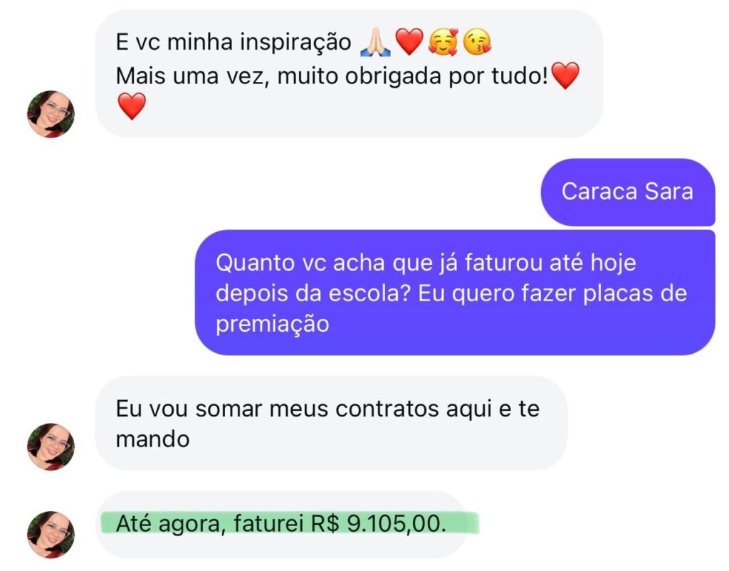 A Sara criou seu próprio negócio no digital e já faturou no total R$ 9.105 reais com a metodologia da Escola.